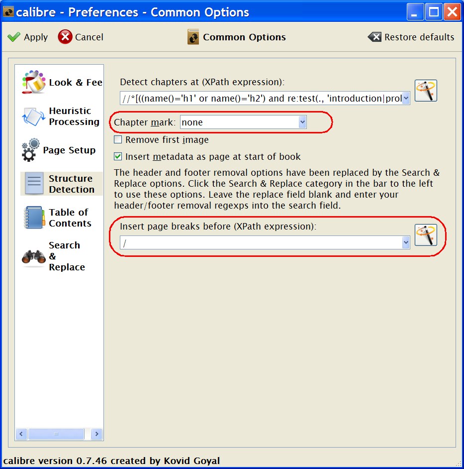 Simply changing the Chapter mark to None and removing any expression the Insert pagebreaks before Window (see attached) in the main Preferences area isn't enough. Calibre remembers old conversions settings. Last edited by DoctorOhh; 02-22-2011 at 11:49 PM. |