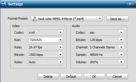 Should point out that you have to manually type in 720x420 for the Video Size (thanks to the original poster for determining this value); it's not a default from the drop-down menu. The only other change I made to the defaults was to set Audio Sample Rate to 48000Hz.