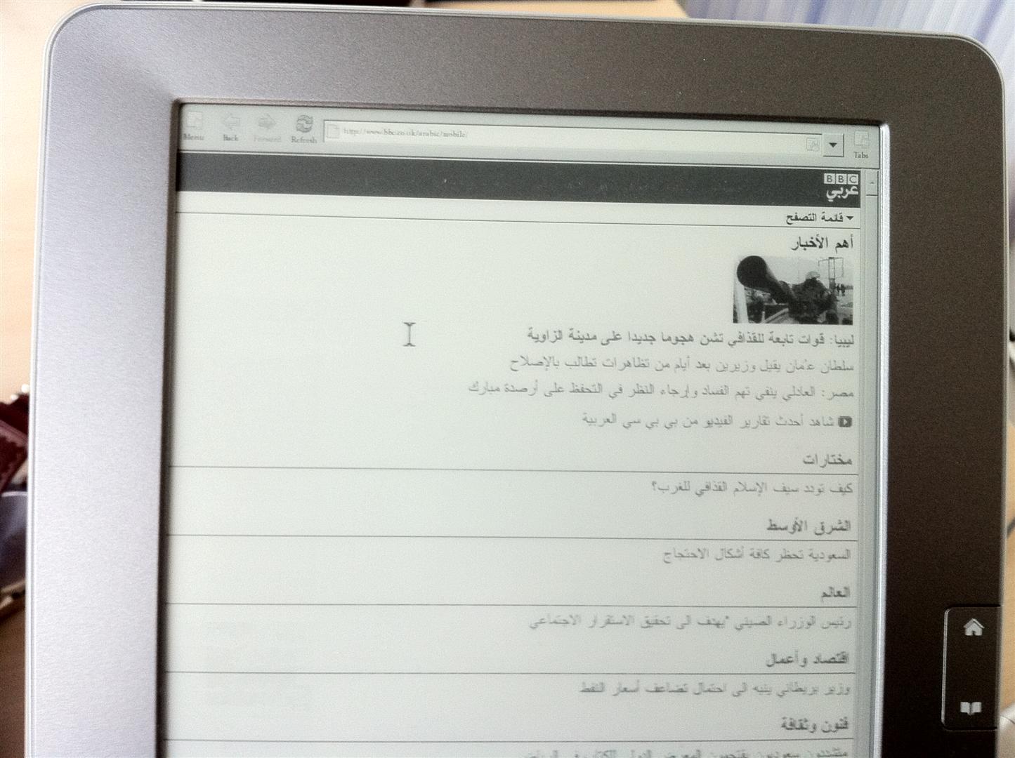 I bought this week the PB 903, which is really an excellent device . One of the important reasons why I ordered this reader was to read news paper in the web, it looks fine except the issue of displaying Arabic Web Pages: Arabic alphabets appear in the right order (from right to left) BUT letters are separated!! I am attaching 2 screenshots of a web page (Arabic BBC) and how it appears on the BP reader and same page on my iPhone Even tried to change the language of the device from English to Arabic did not solve the issue Can you please advise what I can do in order to get Arabic HTML pages displayed correctly? PS: I have seen there is an option in the web browser under encoding to select "Custom" Is there a way to add manually any files there which would help to read Arabic properly? The device firmware version is: D903.2.0.420110106_160908 I checked the date of the SWUPDATE.BIN file in the root directory: Last Modified 20. January 2011, 18:32:00, which seems to be the latest one ? I really appreciate your help Many thanks in advance |