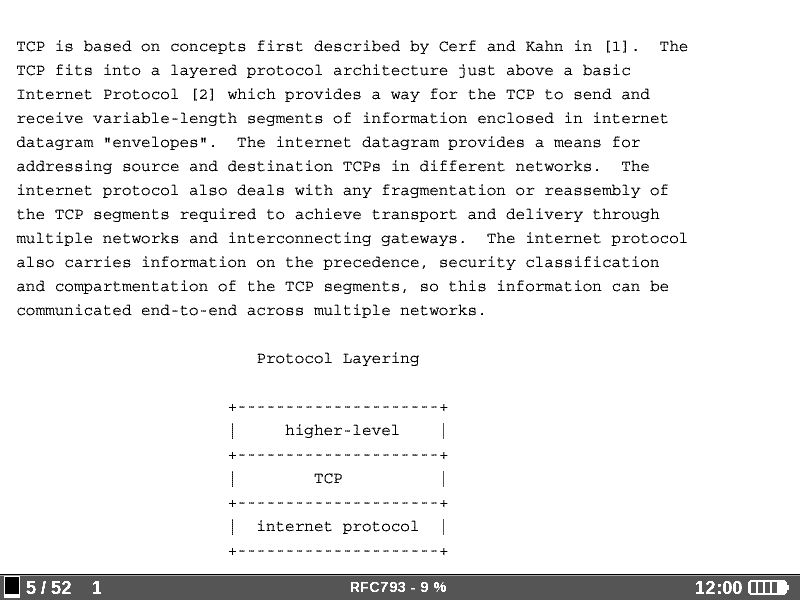 I was trying to load up an RFC (say.. http://www.rfc-editor.org/rfc/rfc793.txt). Notice that the diagrams are basic characters with spaces in between. The reader seems to alter the spacing and linefeeds which leaves the diagrams in a total mess. Does anybody know if there is an option that can be enabled to avoid this problem? |