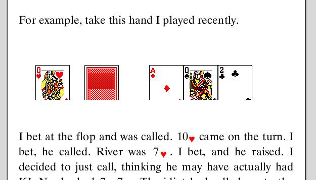 Why is the lrf always cropped in those pictures ? The html code is this : <DIV class=examplewrapper> <DIV class=example style="WIDTH: 439px"> <TABLE cellSpacing=0 cellPadding=0 border=0> <TR vAlign=top> <TD class=examplehand><SPAN class=nowrap> <IMG alt=Ac src="1.gif"/> <IMG alt=Qh src=12h.gif"/> . . . </SPAN><BR>Me</TD></TR></TABLE></DIV></DIV> any suggestions ? |