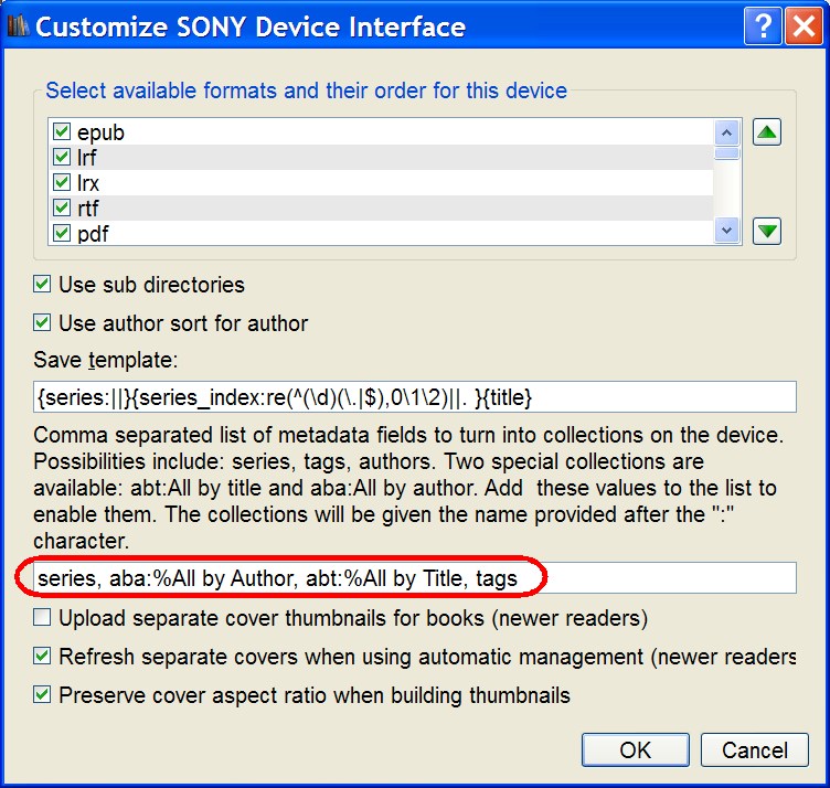 If you have too many tags you can create a custom column maybe called genre and change tags in the plugin to #genre. This will cause collections to be automatically created based on info in the Genre column. The aba:%All by Author and abt:%All by Title are special Sony collections that will provide collections by Author and by Title. Good Luck. |