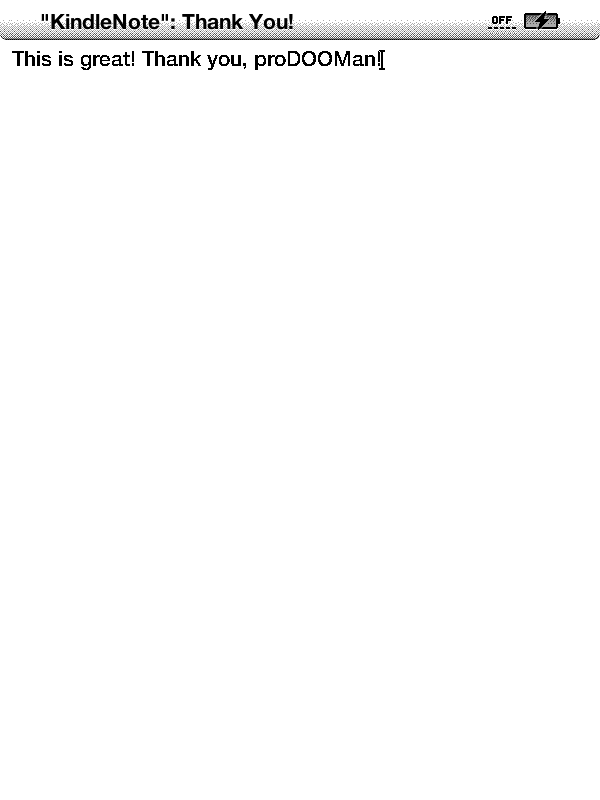 Screenshots: ![]() The working directory of applet is (/mnt/us/)developer/KindleNote/work. in this directory kindlet saves notes and configuration files. There is 2 config files: keyboard.txt and keyboard.png. First of them - alternate keyboard layout settings, and second - OSD hint in edit mode. Keyboard layout changing based on physical keyboard localisation hack. Thanks to Sir Alex Updates: 2013.09.29 - fixed five way button for Kindle 3 with firmware v3.4 2011.05.27 - added workaround for bug "...title have an invalid date". If date on Kindle is too old, it will be set to 1 Jan 2013 2011.04.08 - added encryption of notes. Maybe fixed bug with edit widget focus loss 2011.04.09 - fixed decryption Program homepage: https://github.com/proDOOMman/KindleNote Original thread on russian forum: http://www.the-ebook.org/forum/viewtopic.php?t=18846 NOTE: This applet don't work on Kindle 3 with firmware older then 3.1 Translated by GoogleTranslate and me
