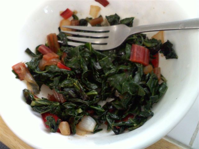 My weekly vegetable delivery was today, so for lunch I sauteed some collard greens, ruby swiss chard, and Vidalia green onions in olive oil. Very fresh and good. I ate some raw carrots with it for some crunch!