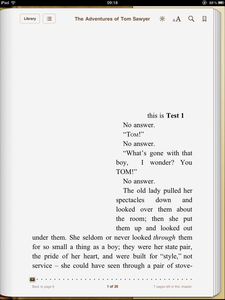 And here comes the results from iBooks. iBooks doesn't always handle svg-images in a good way, which could explain why the images are gone in test 1 and 3. In test 2, there is the image on the first page. The text begins on the second page.