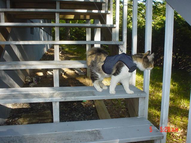 Well KK - you were completely right about the kitty holster! I pick it up & show it to Stella & she runs over & holds still for me to strap it on her. Then she runs down the back steps to the driveway and over to the bird feeders - where she intimidates the squirrels! We're practicing going up & down the driveway, more or less together, to get her used to cars & other folk going by. Then into the lawn! She loves to snack on grass.