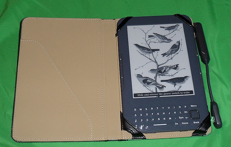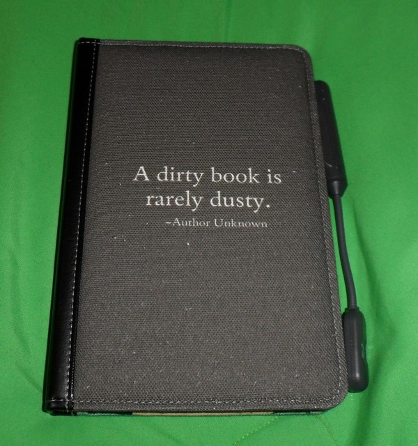 There's also a (slightly out of focus) photo of the keyboard area with the NoKey skin on. The skin looks graphite in incandescent light, dark slate blue with the camera flash, and dark green in natural light and under the LED booklight. It's a little shinier than I would like, but the matte versions had not-so-good reviews. After a couple of days I got used to it. The light is the M-Edge eLuminator, and though I thought having it on the side like that would be awkward, it's actually fine for me. In fact, it keeps me from accidentally hitting the page turn buttons, but isn't in my way when I do so on purpose. I tried a couple of other cheaper lights a few months ago, and didn't like those, but I really like this one. It takes a AAA battery, which we already have a ton of around the house. |