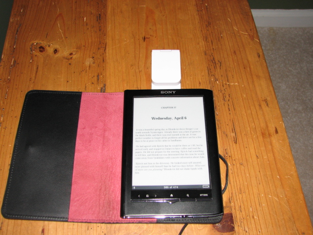 http://www.kaboodle.com/reviews/prot...mart-booklight Disclaimer: I have no association with B&N or with Protocol - just think it is a handy gadget that might interest others. Pics - first on left shows the reader from the back, with the light inserted. Second from the front, and then a couple to try to show it in use - those are hard pictures to take! It looks more glarey and uneven in the camera than it does in person. Glare may depend on the screen of the eReader you have so YMMV. |