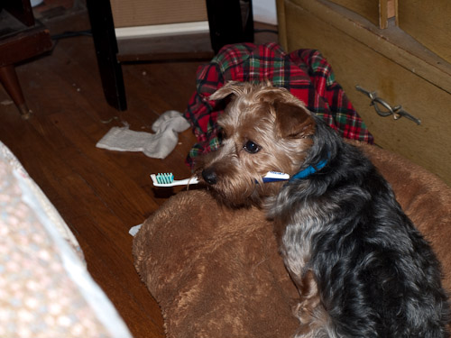 I just realized, I don't think I've ever posted a pic of my baby! Two pics attached. One shows his love of dental hygiene and shows off his "summer cut", and the other shows him in his winter "hippie style" hairdo.