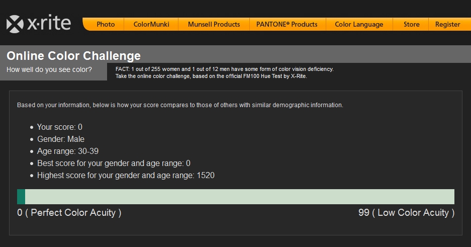 Everyone has a one-digit score and mine is two?? Does that mean I'm color blind???? ![]() Quote: