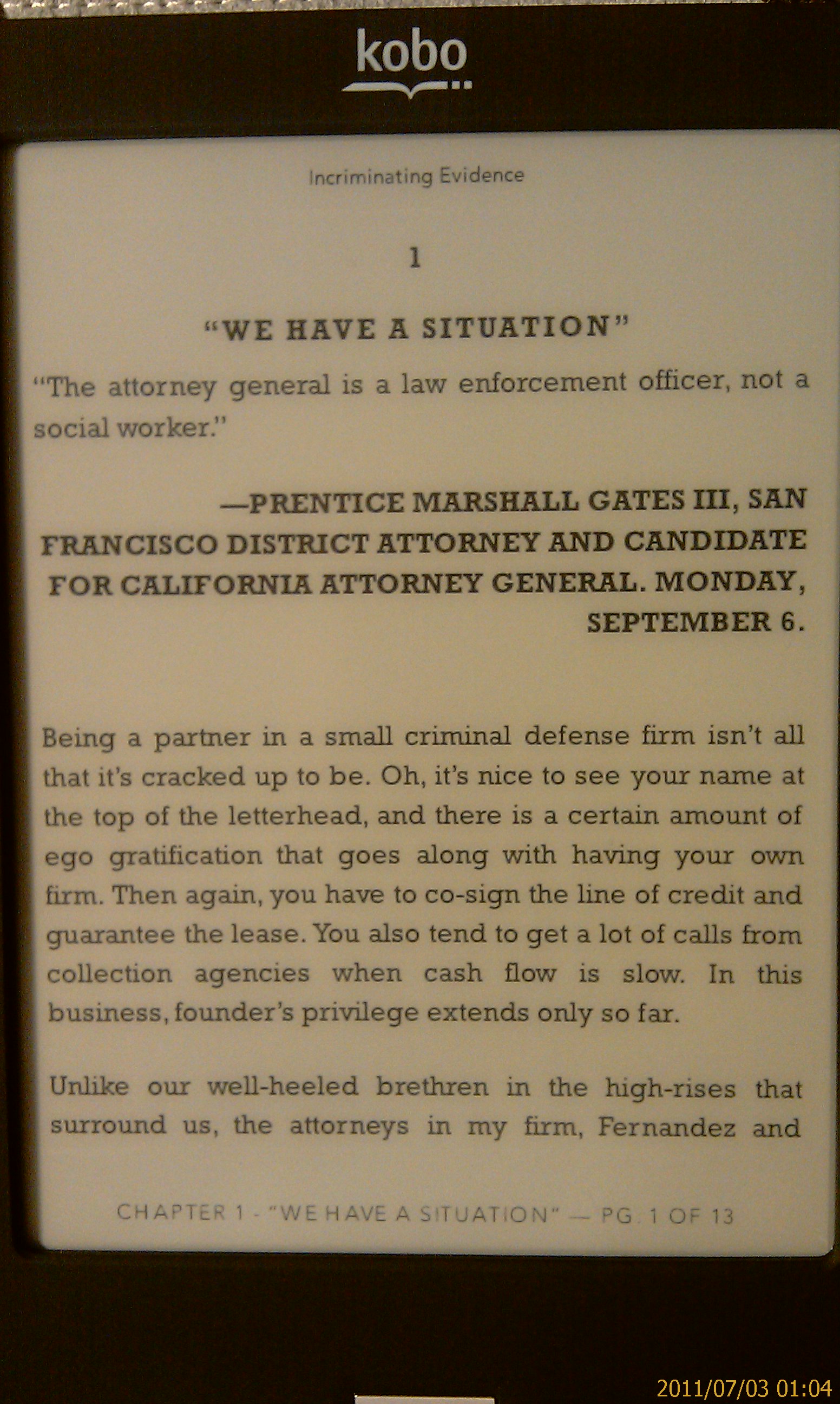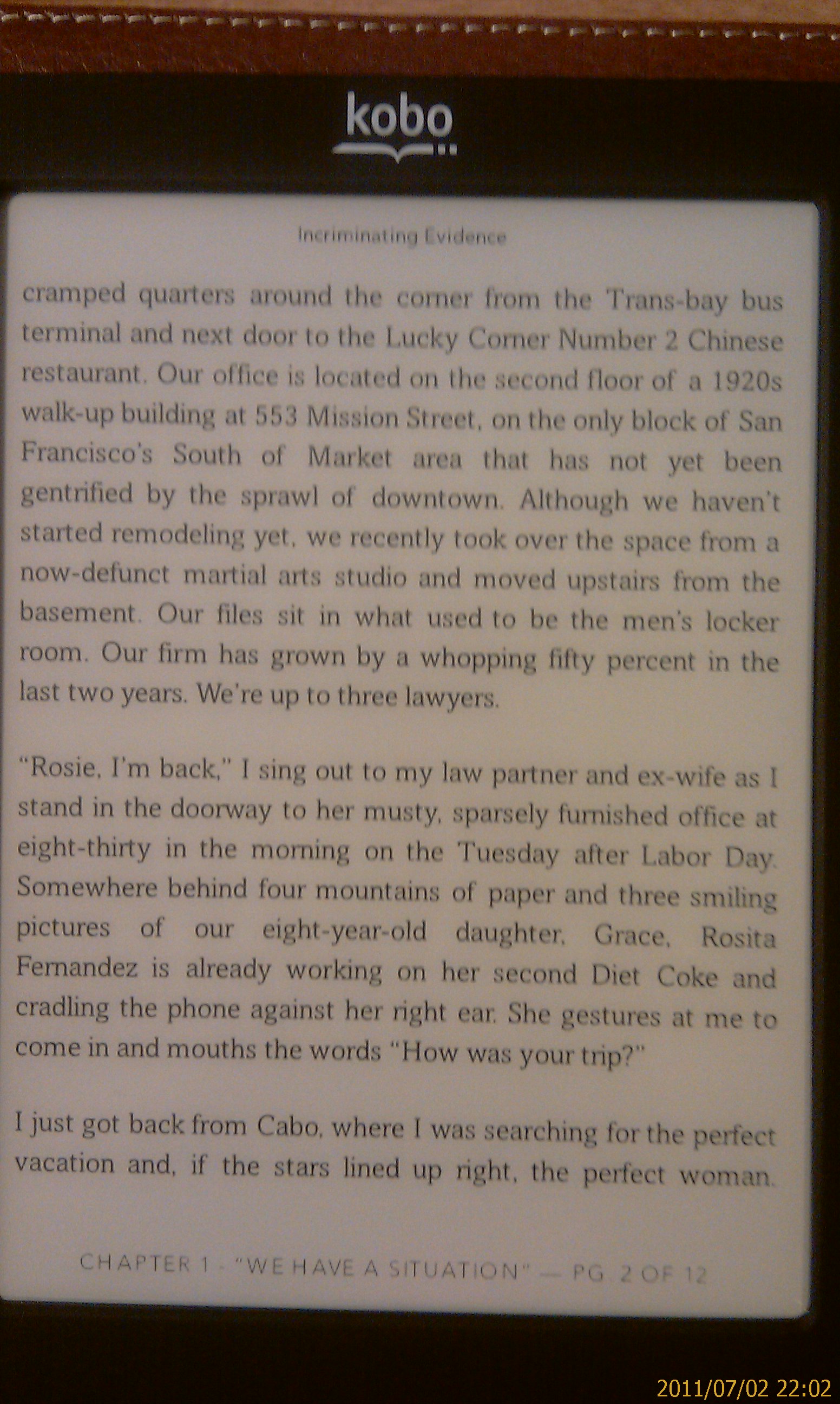 Home screen looks better in person. When looking at the videos I kept thinking it was too plain (compared to NOOK). At first glance one may prefer the NOOK's home screen, but after using the NOOK many don't care for it, and avoid it. While I was typing this, it went into sleep mode. A book cover is displayed with the percentage read underneath. The image doesn't take up the full screen. I saw a post in the Kobo forum requesting a bigger image. Maybe we'll see this change. The Kobo wins hands down for rendering text in the most eye pleasing manner. The latest update propels them to the forefront. it's unbelievable how you have granular control over margins, line spacing, and font size. The Kobo has spacing between paragraphs, which I thought would be a negative. You don't sacrifice word count because you can fine tune line spacing and margins to a greater degree than the NOOK. I've attached pictures comparing the same book with same font style (Amasis). The margins on both are set to the smallest setting. This book on the Kobo is much more visually appealing to me. Last edited by SCION; 07-03-2011 at 12:12 AM. |