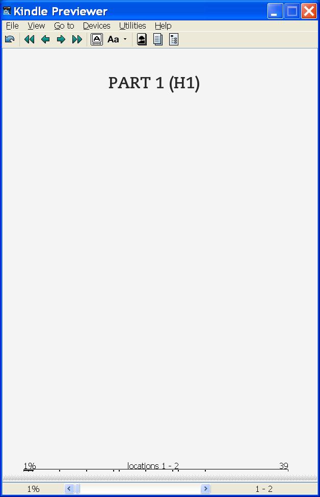 The NCX view is "required by" Amazon for Kindle eBooks, but they are not currently enforcing that requirement. It can be displayed by clicking the last icon at the menu strip at the top of the Kindle Previewer. (see screen shot). Thanks for creating that very effective MobiTest File. With it, I was able to sort out my real problem, which is: Calibre, at default, creates a page break before H2. When there is no body text immediately after the title for H1, that leaves the entire rest of the page blank. (see screen shot) Then H2 starts on the next page. If I try to remove that page break before H2, I create problems with the proper display of H1 and H2 in the NCX file. I have attached the mobi file created from your mobitest. Thank you... and thank you to the others who are helping! CJ |
