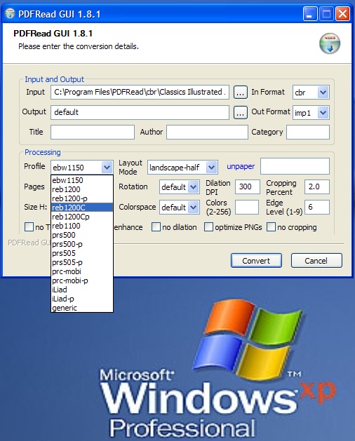 The Windows GUI and Installer is NOT mac-friendly, but the source code is python which can be made to work on Mac OS X using the detailed installation instructions: PDFRead 1.8.2 working on Mac OS X or Update to Mac OS X 10.5.x (Tiger) and pulling together useful links. SUPPORTS: • Input Formats: .PDF / .DJVU / .TIFF / .CBZ / .CBR and also Imglist/Imgdir (i.e. .JPG / .PNG / .GIF / .TIF / .BMP) • Output Formats: .IMP / .RB / .OEB / .HTML / .LRF / .PRC • eBook readers: EBW1150 / REB1200 / REB1100 / PRS-500 / PRS-505 / KINDLE / CYBOOK GEN 3 / ILIAD PDFRead was created by Ashish Kulkarni and announced, over a year ago, in the thread 'PDFRead 1.7 released'. I (Nick Rapallo) have been hacking PDFRead v1.7 since fall 2007 (prior to my join date here) and became a developer along with Ashish Kulkarni. REQUIRED: You must have the (free) eBook Publisher software previously installed to facilitate the conversions to .imp and .oeb. You can install the eBook Publisher software by going here. Then choose to download and install the current version ( Win_eBookPub_2.2.5.exe ). EDIT: Note you MUST enter your own Title, Author and Category in the GUI screen for the Conversion to begin, otherwise it won't start. (If you don't really need them, just enter 1, 2, 3 or T, A, C.) I have implemented some enhancements and fixed minor bugs in PDFRead 1.8.2 Changes in this release: Changelog [2008-04-16] 1.8.2 (by NR) Previous changes:• added an 'imgdir' In Format where you can select any image in a directory and have all images (files) in that directory loaded. This is similar to an 'imglist' but creates its own list of filenames without needing a (previously created) text file. • for .prc output, removed current limitation on image sizes (480 max. width) and now use a modified 'html2mobi.exe' program. This should no longer cause large white margins. Cybook Gen 3 users are cautioned that images larger than 480x640 may crash your ereader. Please limit the Size H: and V:! An alternative solution exists with 'mobi2mobi --gen3imagefix' offered by tompe's MobiPerl. • remembers last 'Output' directory upon startup, but you will need to edit destination filename or may overwrite previous output. To reset it, just type 'default'. [2008-03-30] 1.8.1 (by NR) • can now install PDFRead to a different drive than your C: drive; just keep the same subdirectory structure for the GUI options file to be loaded properly. • now uses, as a default, the input filename as the output filename (without file extension). • added .prc output format support using opf2mobi.exe from Mobiperl by tompe on mobileread.com. • added .cbz/.cbr input support for Comic books using unrar.exe and creating a (sorted) list of image filenames. • tweaked and added Profiles for PRS500, PRS505, PRC-Mobi (Kindle and Cybook Gen 3), iLiad. On REB1200 only provides a 2 pixel left and right margin to avoid bleeding into the edge of the screen. The default Profiles are: Code: