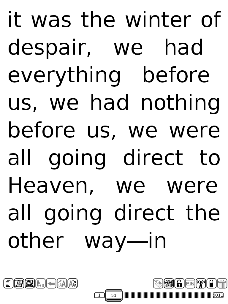 You can load any TrueType or OpenType font onto the machine, and view any book in any font at any of 12 different font sizes; I've illustrated the smallest and largest in the photos above (well, technically the next to smallest - the very smallest is the same size text, with wider margins). You can read PDF docs in landscape, but not (at least with the current firmware) Mobi books. |