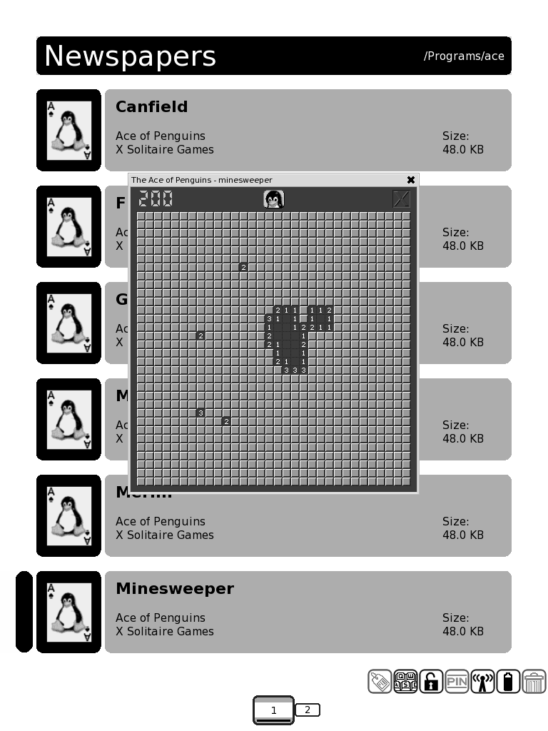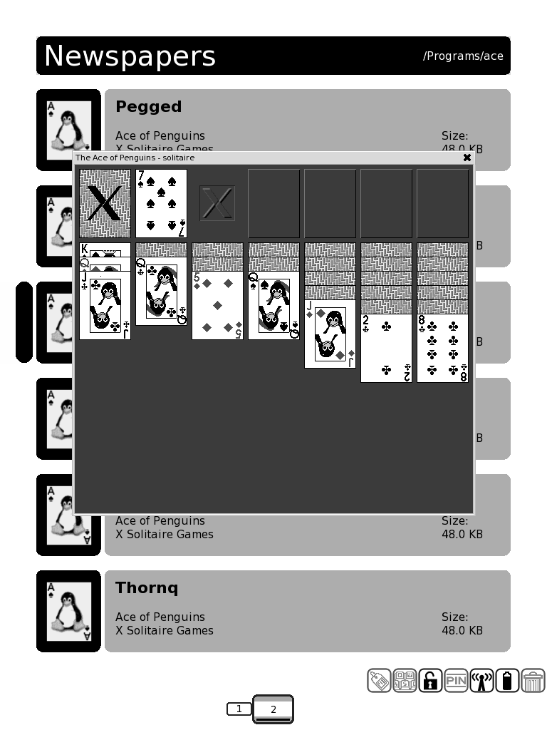 Mobileread member yokos has ported the "Ace of Penguins" to the iLiad.This is an excellent port including Solitare, Minesweeper, and Freecell just to name a few. If you're looking for a good time waster for your iLiad I definitely suggest checking it out. The package contians: freecell, golf, mastermind, merlin, minesweeper, pegged, solitaire, taipei, and thornq. Ace of Penguins homepage Visit this thread for the installation file and continued discussion. |