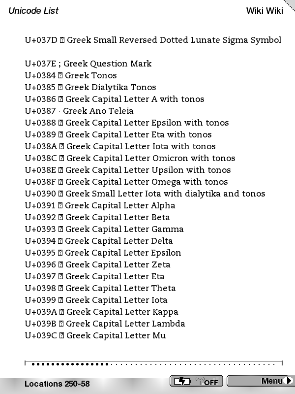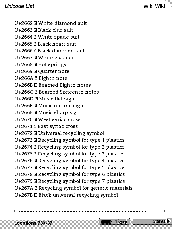 Note that the really interesting glyphs from a eBook perspective are in the range of 200C hex to 2044 but your original sample did not include these. On my decimal page these are the ones from 8204-8260. They have things like curley quotes, emdashes, etc. You might want to try those ranges and see what you get. Dale |