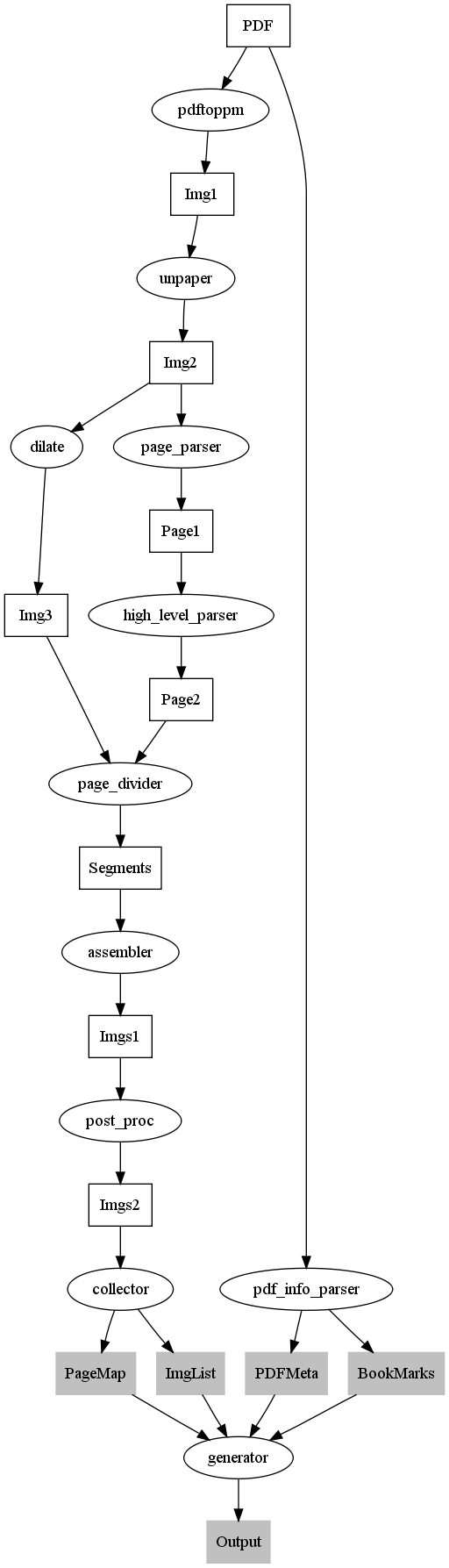 I am interested in ebook reader for quite a while. But after trying with a 6-inch e-ink reader (Hanlin V3), I found it is almost useless to read normal PDF files on these machines. The font size is too small, while the page size is too wide. So, a method to render PDF for these small devices is thought about and prototyped. The details are as follow: 1. Convert pdf to image. I use pdftoppm of xpdf. Such as: pdftoppm -r 180 -f 245 -l 245 -gray -aa yes a.pdf a 2. Analyse the generated images. Break page into lines. 3. Divide each line long enough to two segments. 4. Rearrange the segments into a new page, with half of the width. The example image before/after conversion is attached with the post. I think the result is acceptable. The source code is attached with the post too. The source is released under the License of GPL v2/v3. Best Regards, Huang Ying Basic Usage for version 0.4: tar -xjf pi_0.4.tar.bz2 cd pi . env.sh cd test pi_format.py chap.conf /* output goes in out directory */ img_dir_to_pdf.sh out chap-rf.pdf 2008-09-20 Huang Ying <huang.ying.caritas@gmail.com> * Version: 0.8 * overall: Reorganize program in a more modular way. * pi.image: Add unpaper support for scanned book * pi.image: Add column compress support for scanned book * pi.divide: Add simple divider for divide = 1 2008-08-30 Huang Ying <huang.ying.caritas@gmail.com> * Version: 0.7 * pi.py: Add LRF output support. * pi.py: Add TOC support for LRF output format * pi.py: Add output rotate support. * pdfminfo: Add pdfminfo to extract PDF information such as TOC, title, author, etc. * overall: Add initial windows support, thanks ashkulz of mobileread forum. 2008-08-11 Huang Ying <huang.ying.caritas@gmail.com> * Version: 0.6 * pi.py: Initial implementation of embolden. * pi.py: Use norm coordinate in class Page and Line. * pi.py: Add edge trimming support. * pi.py: Add run pages mode. * pi.py: Add page range support. * pi.py: Re-work ImageOutput, split multi-page image. * pi.py: Rotate during scale if approriate. * img_dir_to_pdf.sh: Add color reduction support. 2008-05-17 Huang Ying <huang.ying.caritas@gmail.com> * Version: 0.5 * pi.py: Detect word, and break lines at word end when possible. * pi.py: Re-align the 'split line segment' (second half of line) to align with the next line's indenting when appropriate. This will make the first line indent and bullet items line up better. * img_dir_to_pdf.sh: Added to convert from images to pdf. 2008-05-10 Huang Ying <huang.ying.caritas@gmail.com> * Version: 0.4 * Some algorithms are configurable * For some text may have problem, present both merged and divided version. 2008-05-03 Huang Ying <huang.ying.caritas@gmail.com> * Version: 0.3 * Rewrite most algorithm in python except the image parsing (break image into lines and characters). This will make it easier to add new algorithm (hack). * pi.py: Add some hacks to deal with equation and figure. 2008-04-29 Huang Ying <huang.ying.caritas@gmail.com> * Version: 0.2 * Split lines in two equal halves or optional equal thirds or equal quarters * Separate output image into customizable page size * Flex can be designate by user configuration * Calculate DPI for each page * Figure detecting and special processing. The figures are scaled to page width and output twice, scaled and split. 2008-04-23 Huang Ying <huang.ying.caritas@gmail.com> * Version: 0.1 Last edited by caritas; 09-20-2008 at 09:14 AM. Reason: Version update |