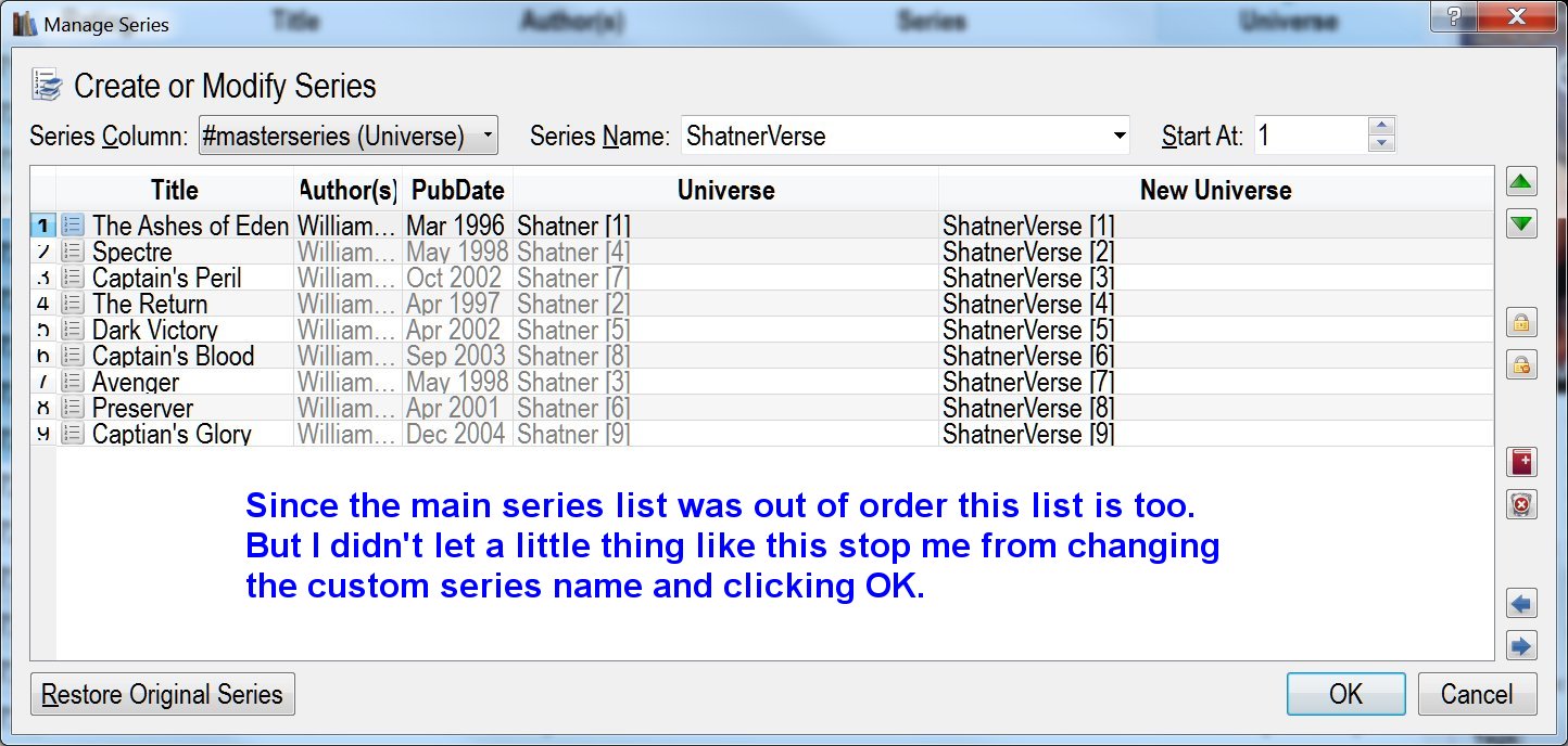 However, please take special note of the numbering in both the Universe and Series columns. Everything was numbered correctly to start out, I just needed to correct the series name. That is the only field I touched in any way. So how did they end up as books 8-10?