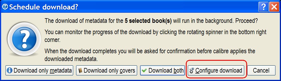 Where are you selecting it at? As far as I know there are three places to get to the screen to change the metadata download options. Preferences - Metadata Any configure download metadata button (see attached) They all take you to essentially to the same page and any changes you make, as long as you clicked apply, (see attached) is applied as the default from then on until you change it. Good Luck. |