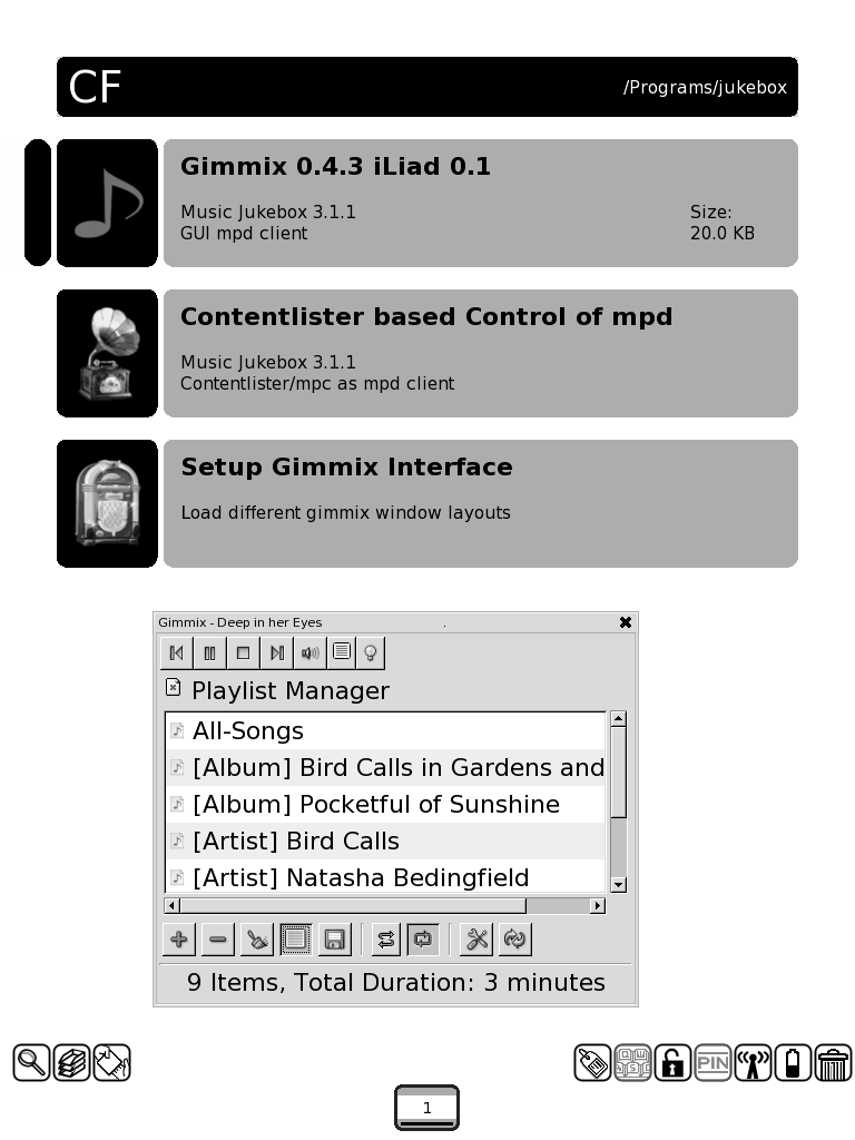 Well, it was fixed on another CF card, but not in the installation package. The installation copied the needed icons into the wrong path _local/share/gimmix/pixmaps instead of correct _local/share/pixmaps. More than 100 users have downloaded/(maybe - who knows) installed jukebox, but nobody reported this bug. Nobody was amazed about the fact that the icons [volume, information ... buttons] in the screenshots above are missing in your installation? Please report bugs.v3.1.1 will follow. |
