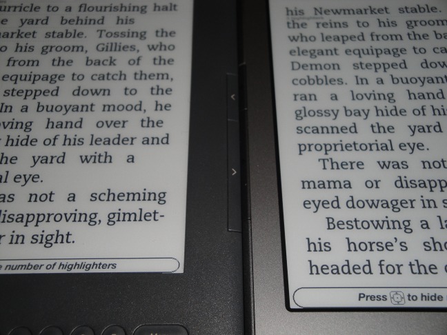 Yup I see it Blossom, but as you can see from my post a little bit up, my two different Kindle Keyboards show the same behavior in screen differences, that is one of the Kindle keyboard has a far lighter background then the other. I think this is normal variation in production, and might indicate production changes from 2010 to 2011 (since the more recent Kindle keyboard has the greyer background)