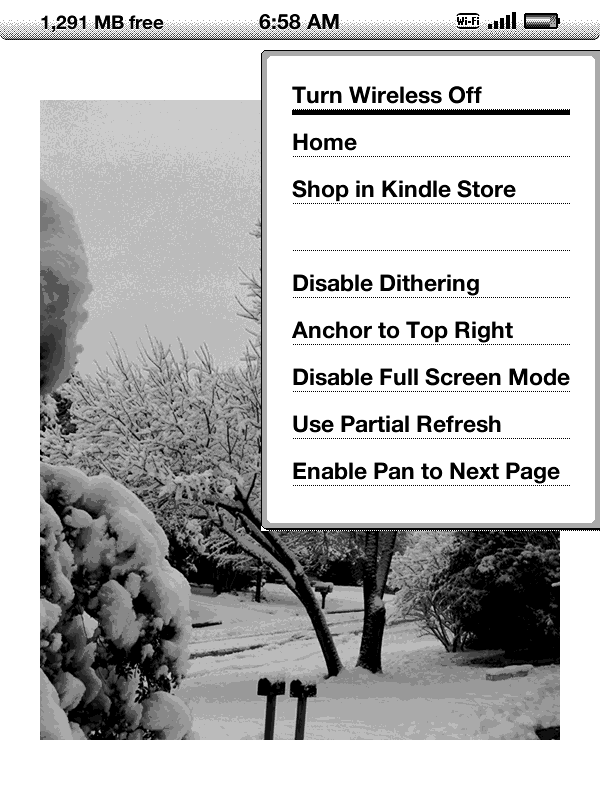 I attached a screen capture of the menu. I cannot see how to pan and/or zoom, but I have not played with it much. After all, viewing pictures on an E Ink device is pretty lame IMO. .... |