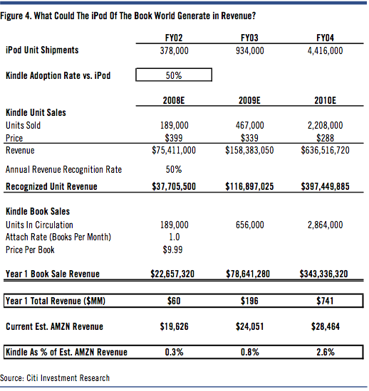 Citigroup analyst Mark Mahaney, who was originally quite down on the Kindle, is now rather rosy about it's outlook making the projection that the adoption curve will follow the iPod but only be half as much. Here are his projections.As much as I adore my Kindle, I also think Jobs had a point when he said no one reads anymore. I think a lot of people do read, but not in huge numbers like those that buy music and videos. Maybe with a more multifunction device, something that was great for textbooks, maybe a huge price drop, I could see that. What do we think? Is 50% reasonable? Does Mahaney need to put the pipe down? Reported by Gizmodo and cNet. Original article at the Silicon Alley Insider. |