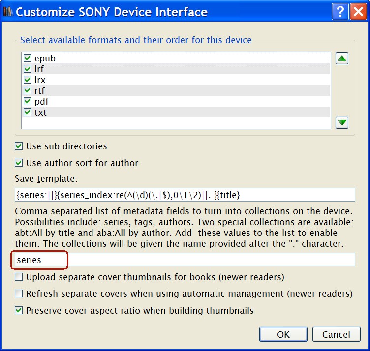 However since you find the majority of your collections to be useless try narrowing the field. Currently I'm guessing your collections are created by calibre based on any tags and series info for a given book. You can minimize collections by not creating collections based on tags. Go to Preferences - Plugins - Device interface plugins - Sony and customize. You will end up with some thing like my attachment. Ensure only Series is in the lower window. This will ensure the only collections created on your device will be based on Series information. While you're poking around go to Preferences - Sending books to device and set metadata management to automatic (see attached). this will ensure any metadata you change will be automatically updated when you connect your reader for any books on your device. Last edited by DoctorOhh; 02-16-2011 at 03:07 AM. |