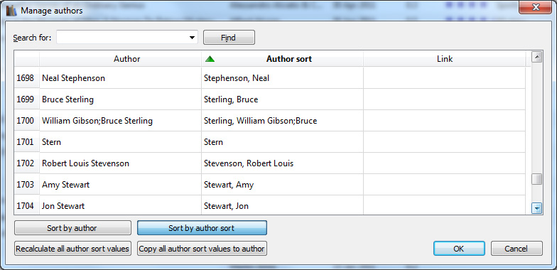 ![]() Are you saying there's a bug, or asking if the data in my database is inaccurate? Either way, it's a PEBCAK problem. Unfortunately I don't know how to fix it. I have an author called Amy Stewart, with sort Amy Stewart. See attached. If I edit the metadata, and click the button between the author and the author sort, it updates the author sort to Stewart, Amy, which is what I want. If I then click and hold the button, and select Manage Authors, and click the Recalculate all author sort values button, the value is changed back to Amy Stewart. ![]() Any idea how I update all author sort values to lastname, firstname? Thanks |