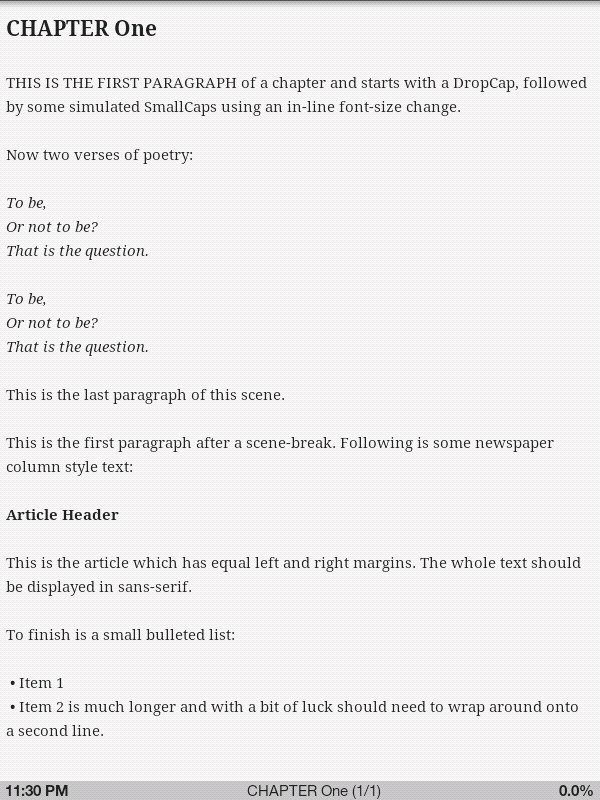 Many thanks for taking the time to experiment and take pictures FBReader and MoonReader don't really come very close, do they?@tayseidel, Regarding CoolReader, if I was to create a completely different epub which contained the same sorts of visual styles, but used totally different css class names, would your existing CoolReader config work on both epubs or would you need to totally tweak the config for the second one? @vishcompany, Regarding Calibre News. I'm assuming a typical News epub is very reliant on hyperlinks to jump from section to section. Do these work correctly in the other apps? |