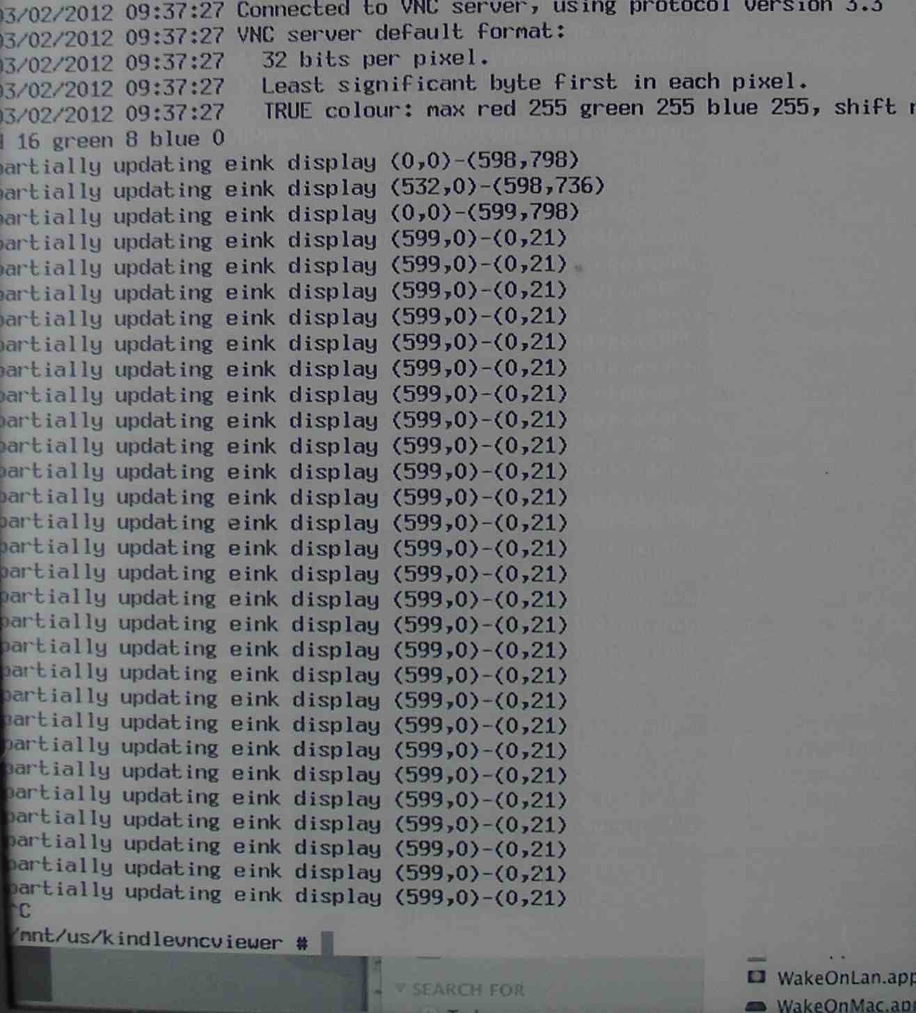 Tried the x11vnc, seems to be more stable, but still disconnects. Again, had to use a beta version (0.9.14), since there's an advice about a broken openGl function on OSX lion... The server side shows: 01/02/2012 02:48:44 Got connection from client 192.168.2.2 01/02/2012 02:48:44 other clients: 01/02/2012 02:48:44 192.168.2.2 01/02/2012 02:48:44 denying additional client: 192.168.2.2:34762 01/02/2012 02:48:44 Client 192.168.2.2 gone 01/02/2012 02:48:44 Statistics events Transmit/ RawEquiv ( saved) 01/02/2012 02:48:44 TOTALS : 0 | 0/ 0 ( 0.0%) 01/02/2012 02:48:44 Statistics events Received/ RawEquiv ( saved) 01/02/2012 02:48:44 TOTALS : 0 | 0/ 0 ( 0.0%) 01/02/2012 02:48:44 rfbProcessClientNormalMessage: read: Connection reset by peer 01/02/2012 02:48:44 client_count: 0 01/02/2012 02:48:44 viewer exited. 01/02/2012 02:48:44 deleted 40 tile_row polling images. 01/02/2012 02:48:44 macosxCG_refresh_callback: unregister The kindle side shows: partially updating eink display (256,595)-(1149,713) 01/02/2012 02:48:45 read (110: Connection timed out) error while handling RFB message. 01/02/2012 02:48:46 VNC server supports protocol version 3.8 (viewer 3.8) 01/02/2012 02:48:46 VNC server closed connection The line 01/02/2012 02:48:44 denying additional client: 192.168.2.2:34762 seems interesting to me... Also tried x11vnc with -loop parameter, but kindle seems to give up, and the connection doesn't reestablish. Anyway, even with these disconnects, its already useful. |