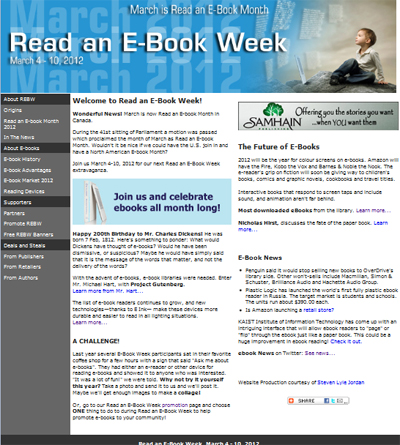 Read an E-Book Week has updated its new website for 2012. Designed by myself, a longtime supporter of REBW (and why not? Web design is my day job), the REBW12 site provides the same great content about ebooks, plus an easier-to-navigate design and easier access to specials and freebies.