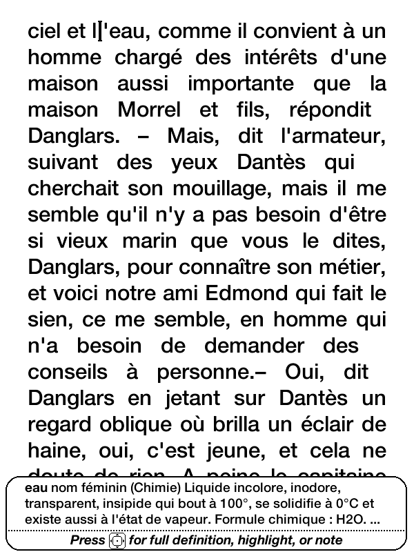 This kills two birds with one stone, it solves the article apostrophe problem and it gives access to a French dictionary that is light years ahead of the Kindle's Miriam Webster. I have not completely given up on the Kindle though, I live in Crete and like to read outside sometimes, where the bright light rules out the iPad, so I keep a copy of the same book on both devices. |