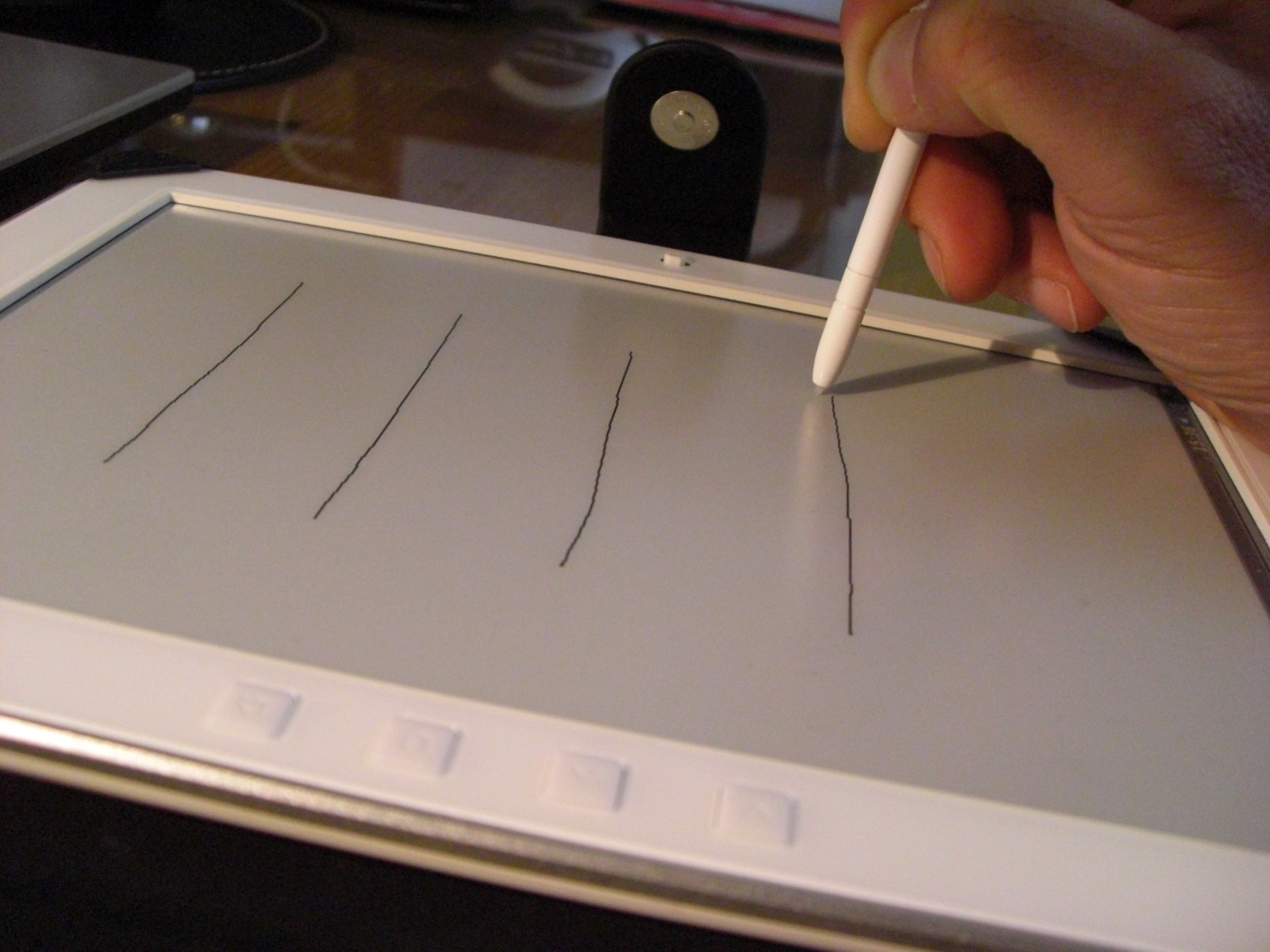 Yes, I have tested everything. See the pictures... I will try to explain it. My apologize if my english is not good enough. See the difference between the lines. At the top of the page, the pencil tip is just where the line is. But when I start moving down the screen, the distance between the tip and the line increases. And... only writing horizontal lines, not with vertical ones. RAFA |