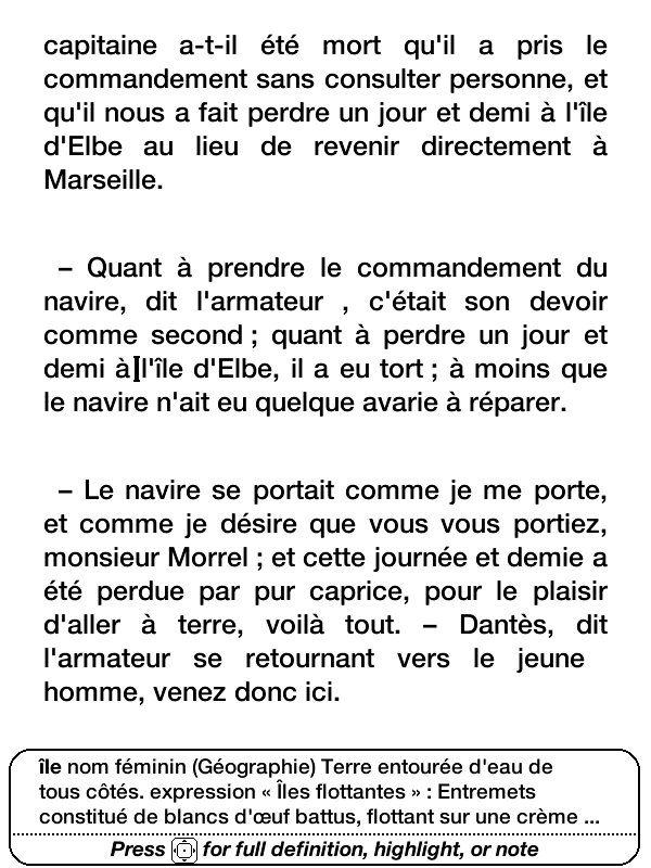 This kills two birds with one stone, it solves the article apostrophe problem and it gives access to a French dictionary that is light years ahead of the Kindle's Miriam Webster. I have not completely given up on the Kindle though, I live in Crete and like to read outside sometimes, where the bright light rules out the iPad, so I keep a copy of the same book on both devices. |