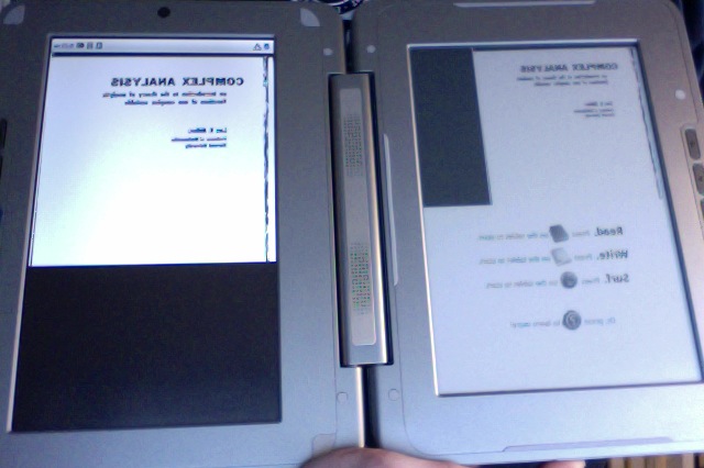 (the second picture is from coolreader, where the text does not fit completely on the lcd side, but fills entirely the e-ink side ...) Last edited by fekhner; 03-12-2012 at 11:39 AM. |