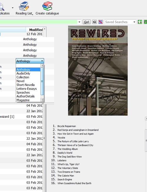 The way I've being doing it is like the above posts. Have a custom column, with the type of book, novel, magazine, collection, Anthology I use this as the definition: Collection being a collection from more than one author Anthology being a collection from the same author etc Then listing the individual stories in the book details Getting the list, either search the book on google for a nice txt list, or open the book and get the list if its in txt. If its in the book as a contents, just screen grab it and past the image into a program that will convert image to txt, I use onenote. Past the list into book comments, select and format as numbered. Good idea to also have an excel list of these type of authors, to easily see if you have the story as a standalone novella as well as in a collection. Searching can be set to include comments, so the stories show up. Thats just the way I'm doing it now, open to any other way that works too though. Last edited by transmitthis; 03-13-2012 at 08:42 AM. |