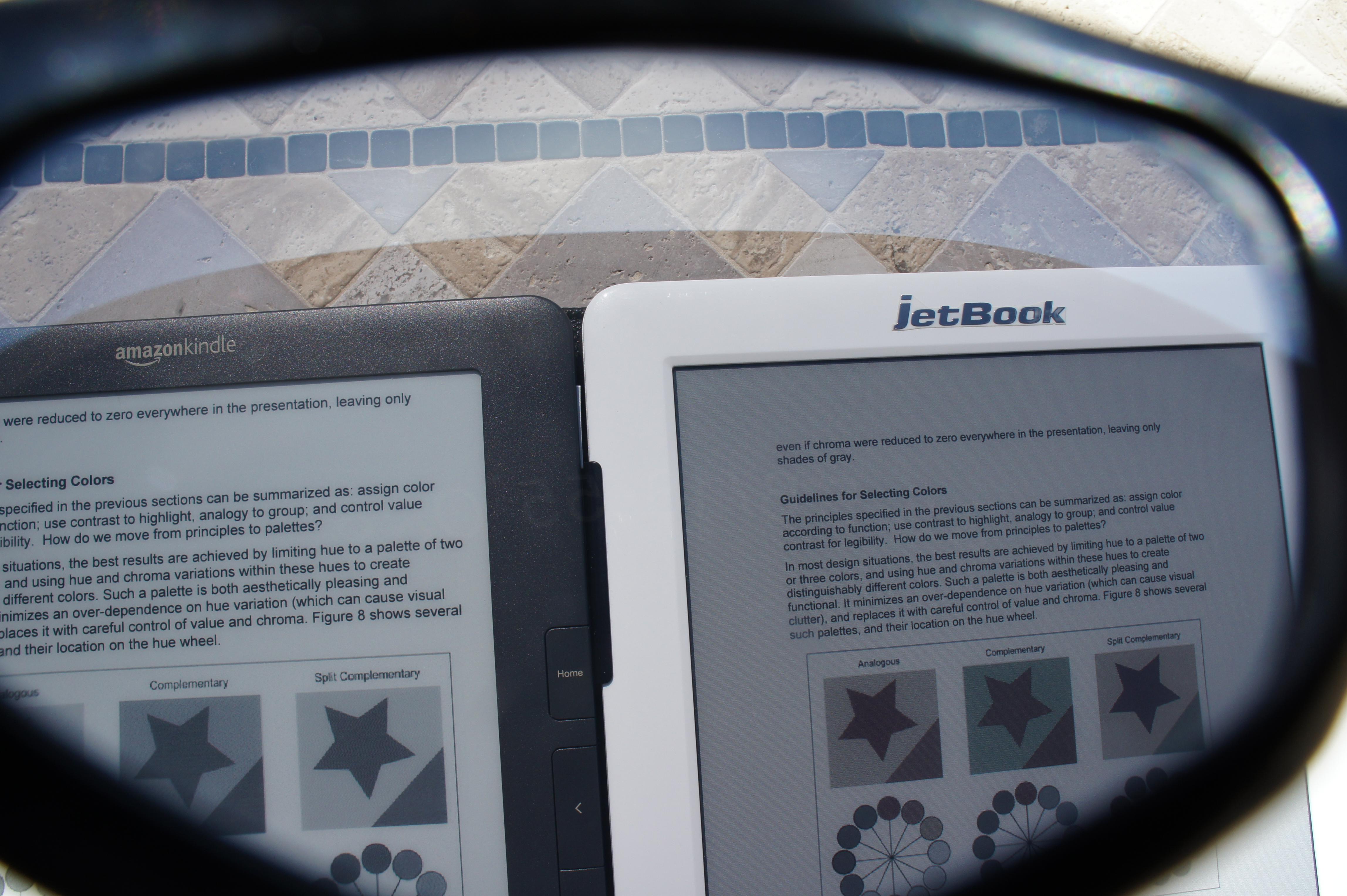 Pictures 1-3 of JBC were taken INDOOR together with iPad 2 to get the idea how the colors look on the brightest possible NATURAL light INDOOR in our place (since Ipad 2 looks bad with the sunshine outdoor). Pictures 4-8 of JBC and DXG were taken OUTDOOR under DIRECT SUNLIGHT with as bright direct sunlight as possible in our geographical area at this time of the year Pictures 9-10 of JBC and DXG were taken with exactly the same light conditions as pictures 4-8 + SUNGLASSES WITH DARK GREY LENSES, since in these conditions in order to read outdoor I HAVE TO use my sunglasses. These kind of direct sunlight is just TOO BRIGHT for my eyes and makes my eyes feel discomfortable (even if I read paper book). Page 6 of the file from lorenzoens is displayed on all these pictures. EDIT: I have trouble uploading pictures 5-10. I will try again. Last edited by Valentinka; 03-25-2012 at 12:53 AM. |