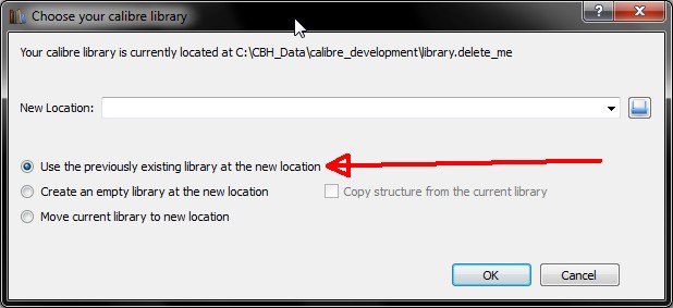 The red arrow points to the choice that permits you to open an existing library. Navigate to a library using the New Location box, press OK, and the library will be opened.