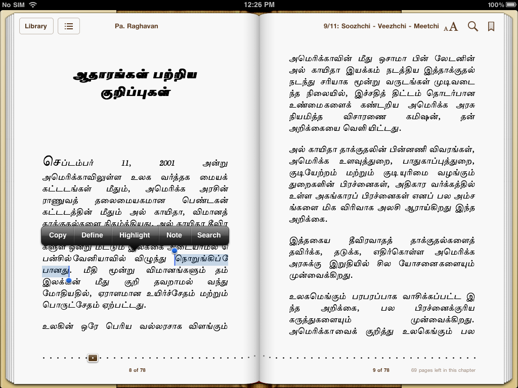 My problem is: I have created one ePUB (TAMIL font "SHREE-TAM-0800.TTF" embedded) and loaded in Ipad ibooks. It displays well but some word unwantedly broken and gives bad reading experience at the end of each line. (Refer attached screenshots) So kindly help me how can i solve this issue. Thanks in advance for suggestions and help. |