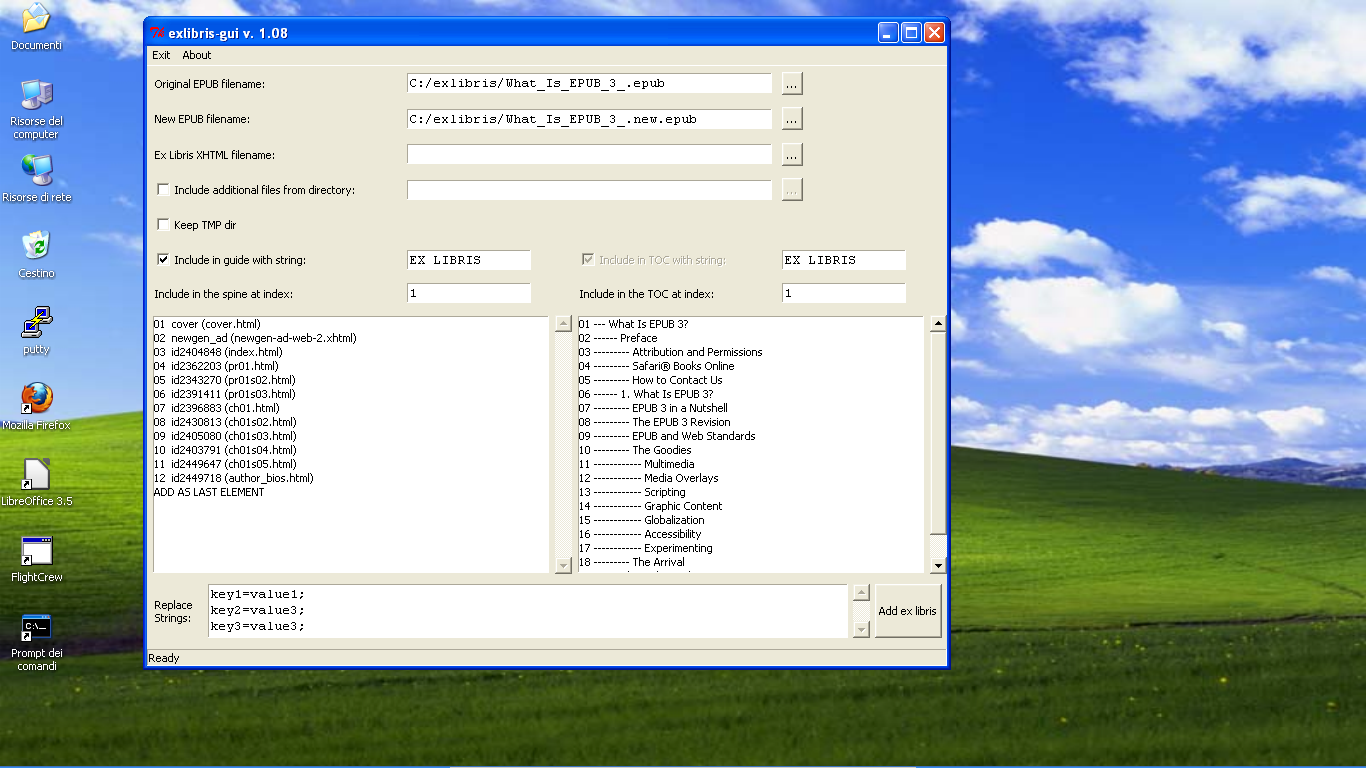 1) now the user can also select the insertion point of the ex libris in the TOC; 2) added --no-guide switch to prevent inserting the ex libris in the guide; 3) added --guide-string and --toc-string switches to specify the strings to be used for the ex libris in the guide and in the TOC lists. IMPORTANT: the option switch -i, which was used to specify the insertion point of the ex libris in the spine, has been renamed to -s (spine) to be consistent with -t (TOC) switch. |