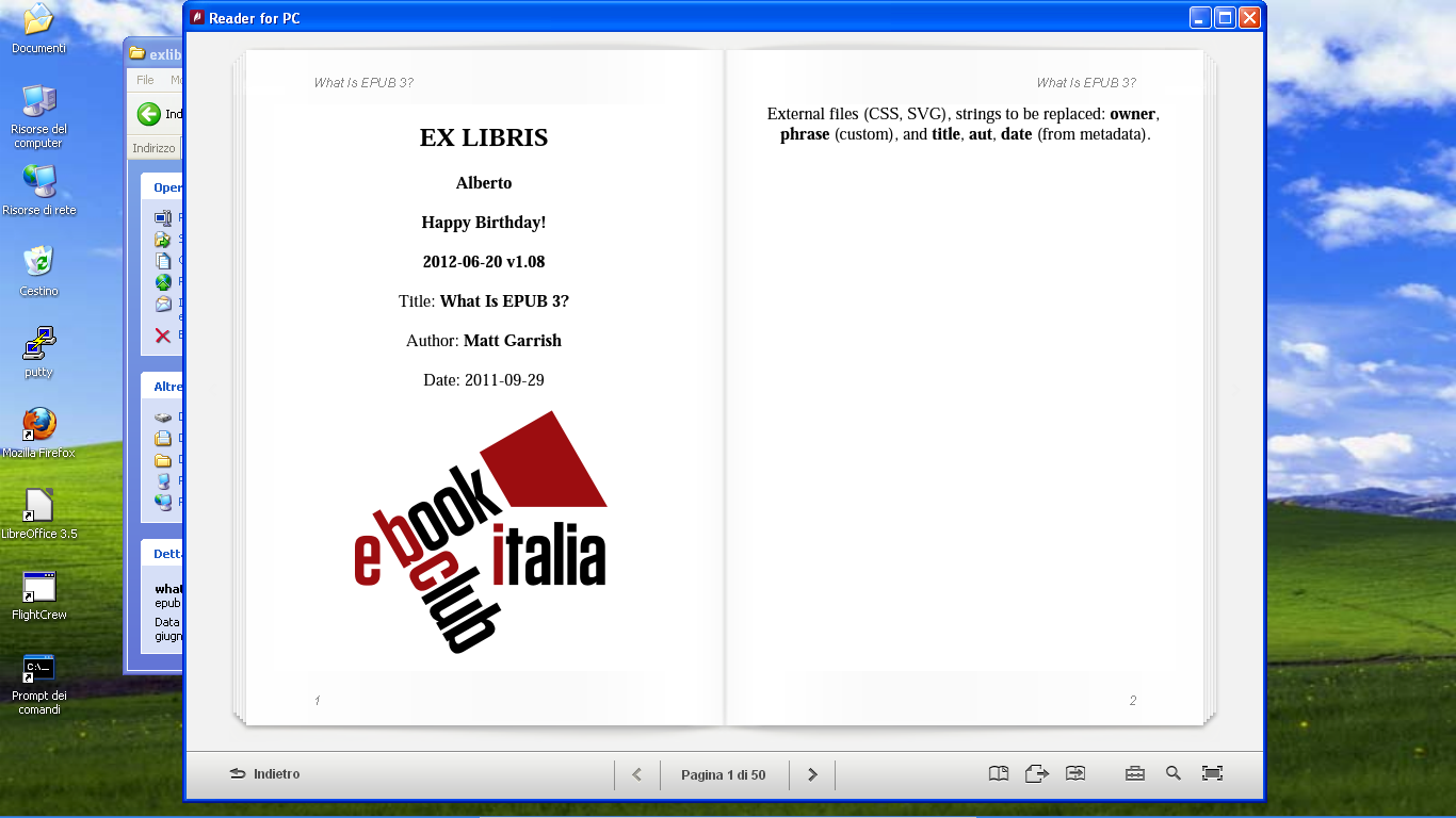 while read member do id=`echo $member | cut -d" " -f1` name=`echo $member | cut -d" " -f2` python exlibris-cli.py book.epub "book-$id.epub" exlibris.xhtml -r "name=$name;" done < members.txt Again, besides creating the file members.txt (in my case, exporting it from a database, and containing id and name for each "member", one member per line) there is no manual editing at all. In the specific case, I had to create a personalized EPUB for more than 100 people. Finally, someone suggested the idea of providing a GUI for those that are not in friendly terms with the command line and, eventually, a Calibre plugin, given the popularity of the latter. But these are intended just as different ways of invoking the main exlibris library. To continue the analogy, for example by selecting a subset of your calibre library rather than using the for loop of my first example. Let me know if something is still unclear. Last edited by AlPe; 08-12-2012 at 03:58 AM. |