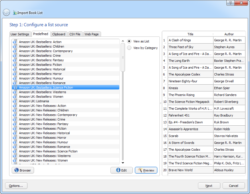 In this particular case I am very interested in any suggestions if the plugin is going to push a few buttons for people to make it more useful to them. I saw a post the other day from someone new to calibre who had their book collection stored in Access or Excel from memory - if they exported that as CSV this plugin already has the functionality to import that for them.I am particularly interested in websites people would like to import from, because it is only through trying to setup xpath/regexes for those do I find out just how "usable" that tab is. I've already got built-in configurations defined which will take any Amazon "Listmania" list. I've also got any Goodreads "Listopia" list covered, as well as their "Most popular in xxx" type lists. For those sorts of sites you can just click the "Load" option in the plugin, drag/drop or type in your specific list url from the website and you are off and running. If you want to reuse that URL you can save it as your own settings. I've also randomly tried a few other pages like Wikipedia Nebula Best novel winners etc and so far they all were fairly easy to setup. I'm still tweaking and tuning it to try to automatically strip the most common "cruft" out and maximise the likelihood of matches without manual effort but it is fully operational in its current state. I've held off on the beta due to no-one responding and let myself get diverted with the "Favourites Menu" plugin and also a big release of "Find Duplicates" I will put out there after the next calibre release. |