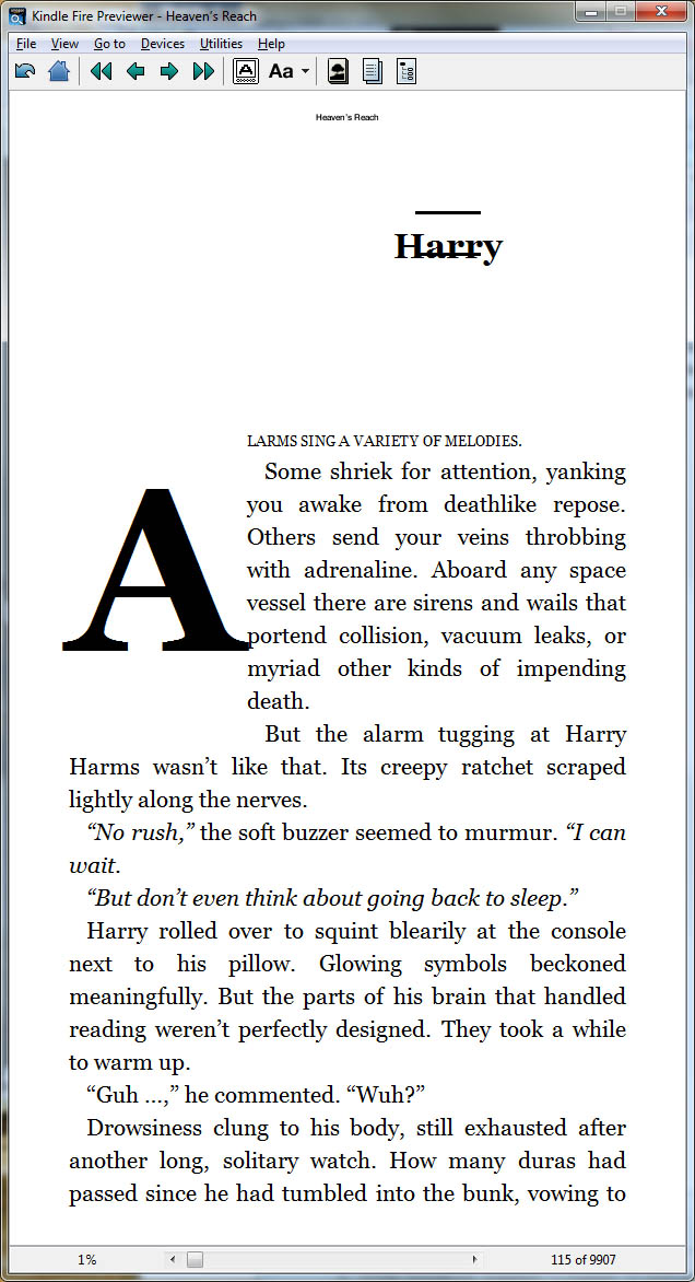 ![]() Also my Kindlegen output has the top and bottom line around Harry in Kindle previewer as well. ![]() The fact that we can get different results off the same ebook sort of scares me. Last edited by Zeebra; 07-08-2012 at 08:17 PM. |