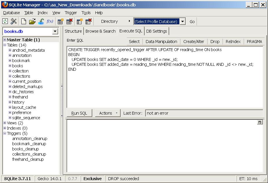 I ran the code in the books.db from both the reader and my SD card using the 'SQLite Manager' add-on for Firefox, and everything worked perfectly