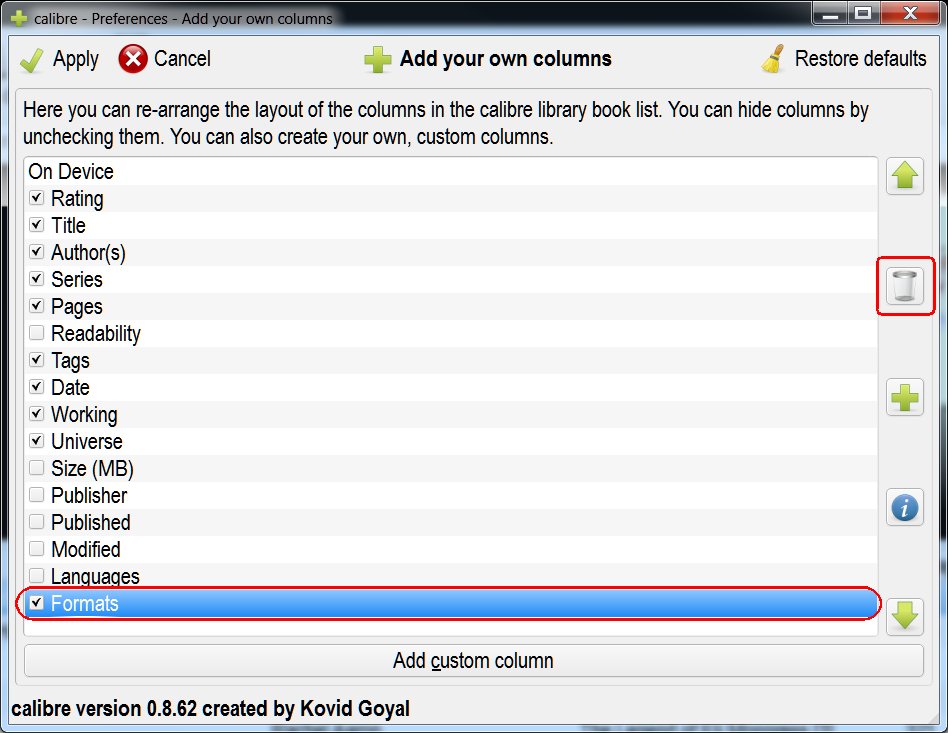 Judging from your attached image, you created a custom column with the title Formats. That would be the column where your invalid template is located. The name directly next to the Template Error is a clue (see attached I circled it in red so you won't miss it.) The template for the custom column called Formats, by default creation, looks like the attached (again circled in red for your convenience.) I'm guessing your template is messed up. Either fix the template or go to Preferences - Add your own columns and delete the custom column (see attached). Alternatively if you don't want to deal with the complication of fixing the template or deleting the custom column you can go to Preferences - Look and Feel - Book Details tab and uncheck the second Formats you find in the list (see attached, labeled and circled in red to remove all doubt.) Good Luck! Last edited by DoctorOhh; 08-01-2012 at 04:51 AM. |