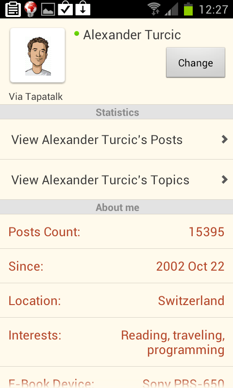 I had Tapatalk on my iPad but because Mobileread is the forum I use most and wasn't Tapatalk ready, didn't use it too much. I bought the Android version and is fantastic on my Galaxy SII. Addictive, should I say. Changing the avatar is even easier, as I usually take pictures of Lolis via phone.