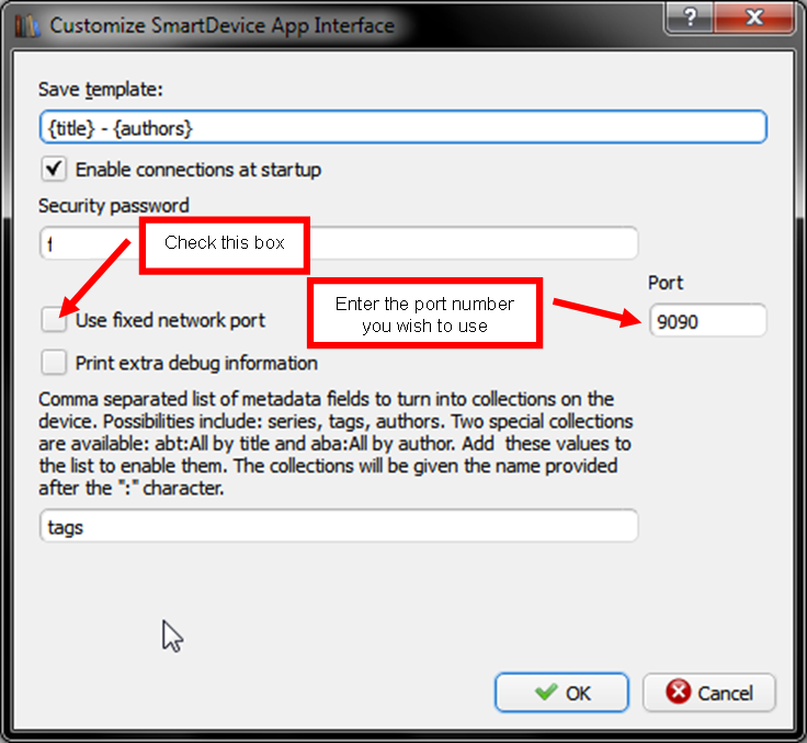 Now to the problem: You say that the IP and port are correct and that you can open the library with other computers. First question: when you connect with other computers, what are you connecting to? Calibre's content server? Second: why did you enter an IP address in the app? Doing so is normally unnecessary. If, however, you have one of the wireless routers that blocks multicast or if you have a firewall on your computer that blocks access port-by-port, then you will need to enter the address and port. Third: assuming it doesn't work when you enter nothing in the IP box, what port did you use? It must not be the port of the content server. Instead, it should be the port you see in calibre's Smartdevice plugin customization panel. By default, the smartdevice driver uses a random port number. To use a fixed port you must change values in device customization. In calibre, go to the device customization panel for the Smartdevice driver (Preferences -> plugins -> Device interface plugins -> Smartdevice app interface). Check the box "Use a fixed network port". This screenshot shows you the device customization dialog. Change the default port number (9090) if you wish. Note down the port number you use. Be sure that the port number in the app and in calibre are the same. Also be sure that your firewall is not blocking that port. Fourth: assuming that the port numbers are the same and things are still not working, then we need to get some information by running calibre in debug mode. Start calibre, then click the small down arrow next to preferences as shown in this screenshot. Click on "Start calibre in debug mode". Let calibre restart and answer OK to the dialog that confirms that calibre is in debug mode. Using your Tab, attempt to connect to calibre. Wait at least 30 seconds, then close calibre. You will get a window containing calibre's debug log. Post that debug log here. While you are looking at it, verify that smartdevice interface is starting and that it is using the port you assigned. When I do these steps, I see the following log (this isn't all of it). Spoiler: