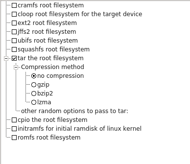 Package managers: IPKG: The Itsy Package Installer from handhelds.org Opkg built instead. Real-Time XENOMAI: Real-Time Framework for Linux http://www.xenomai.org Xenomai is split in two parts: a kernel part and an userspace part. So, No. System tools QUOTA: Implementation of the disk quota system. Selects: BR2_PACKAGE_UTIL_LINUX (which select UUID stuffs, which die, see death reports) Text editors and viewers nano is NOT optimized for size Host utilities Spoiler: