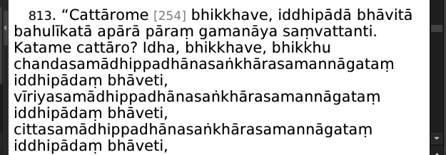 <p class="bodytext"><a id="para813"></a><a id="para813_sn5"></a><span class="paranum">813</span>. “Cattārome <a id="T5.0326"></a><a id="V3.0328"></a><a id="M3.0222"></a><a id="P5.0254"></a><span class="pn">[254]</span> bhikkhave, iddhipādā bhāvitā bahulīkatā apārā pāraṃ gamanāya saṃvattanti. Katame cattāro? Idha, bhikkhave, bhikkhu chandasamādhippadhānasaṅkhārasamannāgataṃ iddhipādaṃ bhāveti, vīriyasamādhippadhānasaṅkhārasamannāgataṃ iddhipādaṃ bhāveti, cittasamādhippadhānasaṅkhārasamannāgataṃ iddhipādaṃ bhāveti, vīmaṃsāsamādhippadhānasaṅkhārasamannāgataṃ iddhipādaṃ bhāveti. Ime kho, bhikkhave, cattāro iddhipādā bhāvitā bahulīkatā apārā pāraṃ gamanāya saṃvattantī”ti. Paṭhamaṃ.</p> And this is a shot when I make the page more narrow, simulating a smaller screen (note, I'm just changing the viewing window size). You can see that the fifth, seventh and ninth line run off the screen. |